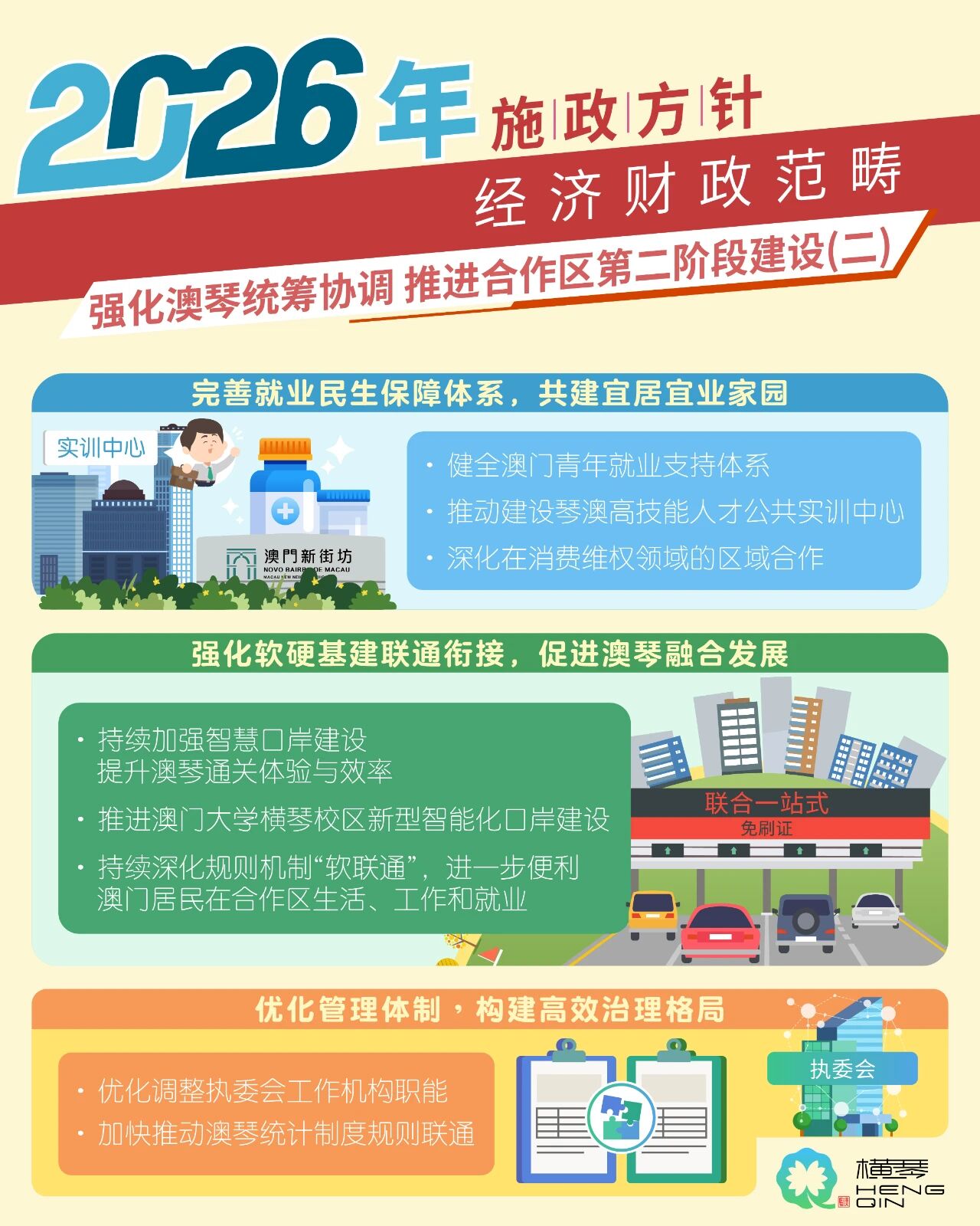 澳门特别行政区政府日前已正式公布2026年施政报告,指出将加强统筹协调,抓紧重点工作,紧扣“澳门+横琴”的战略新定位,以澳琴一体化为目标,推进合作区第二阶段建设。