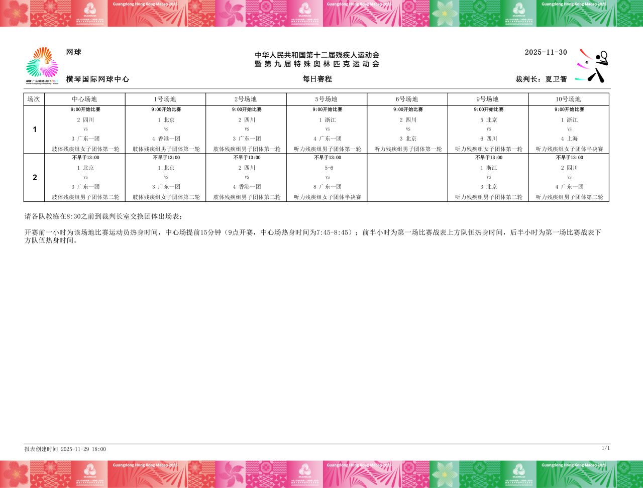 中华人民共和国第十二届残疾人运动会暨第九届特殊奥林匹克运动会网球项目于11月30日至12月4日在横琴国际网球中心举行。各项目签表已经新鲜出炉,11月30日率先展开团体赛前两轮的争夺。