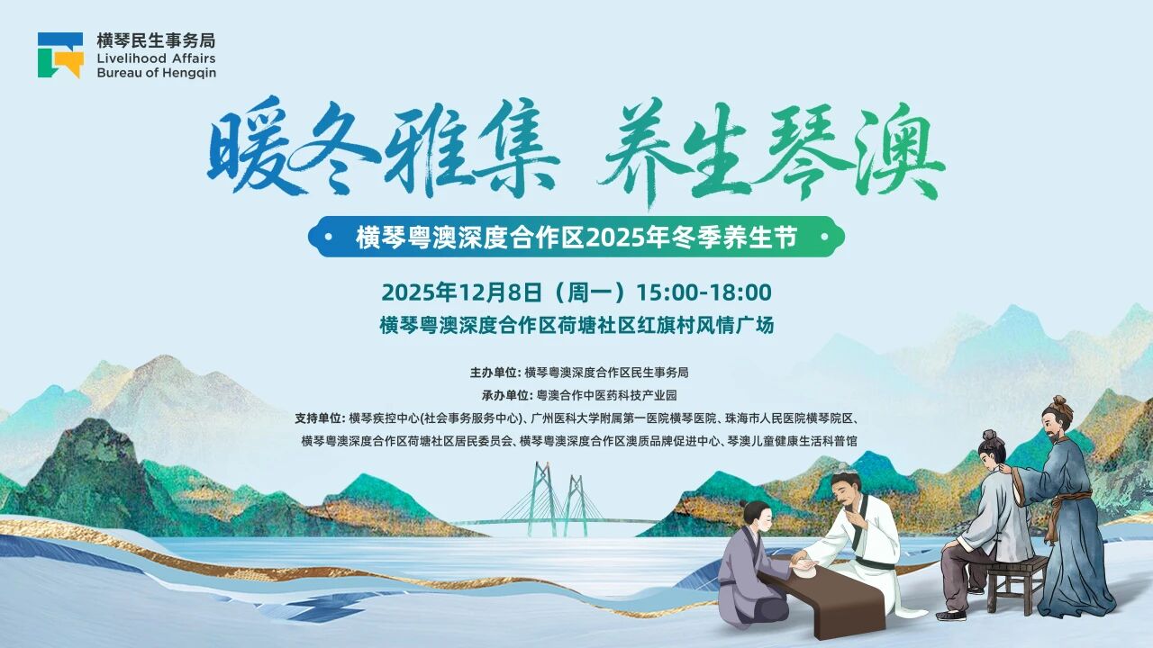 12月7日将迎来今年的第21个节气“大雪”。仲冬时节如何调养身心?做好人体健康的“冬藏”工作?答案就在“暖冬雅集 养生琴澳”横琴粤澳深度合作区2025年冬季养生节。12月8日(周一)15:00-18:00,横琴风情广场给您送温暖送健康。