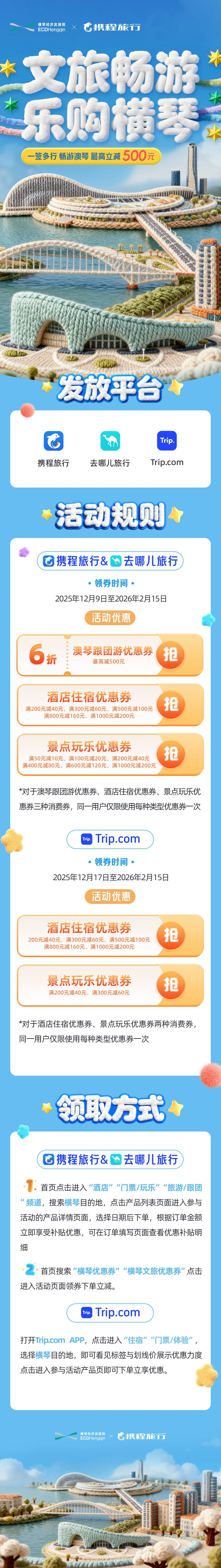 “文旅畅游·乐购横琴”消费券活动再升级,携程、去哪儿等多平台联动畅游琴澳。