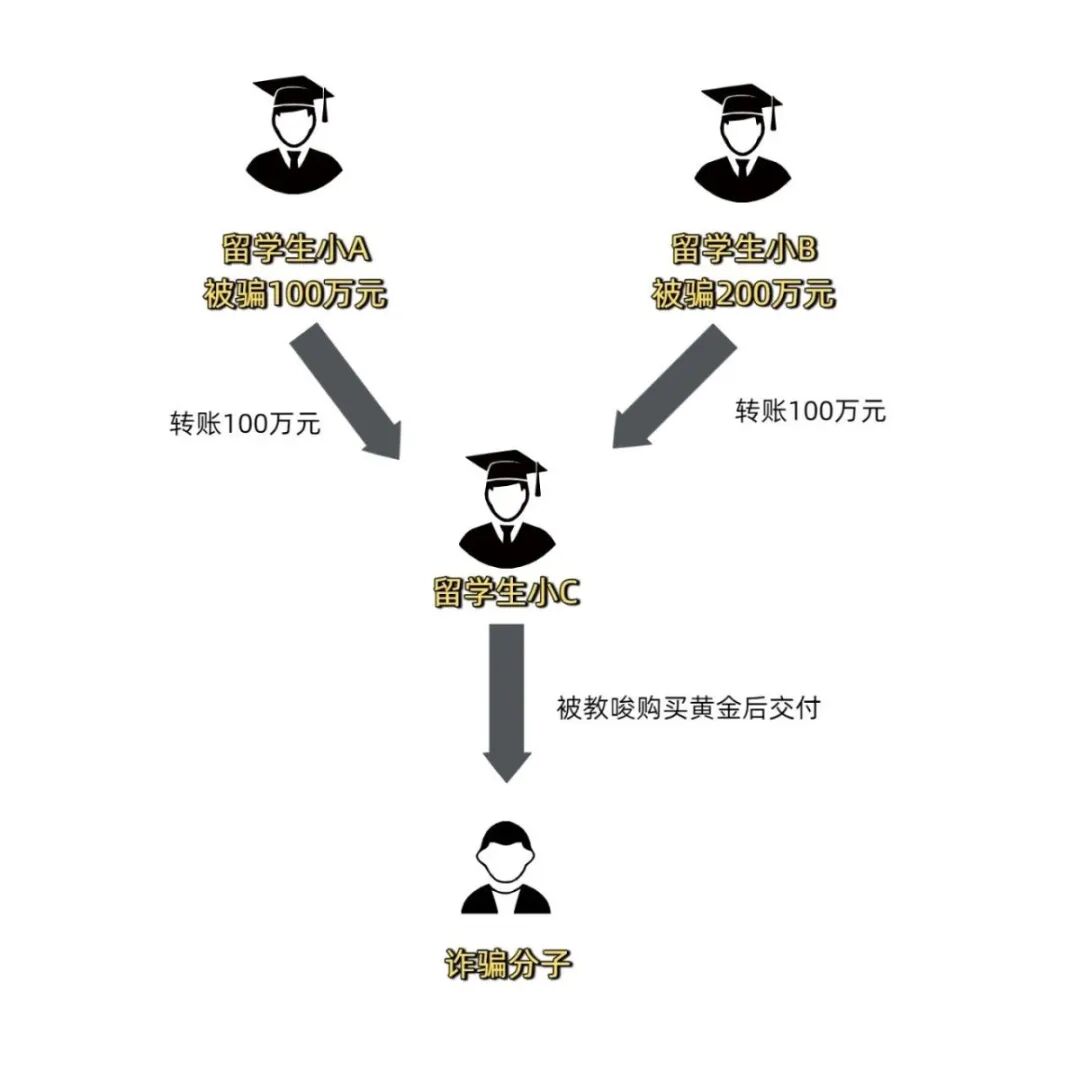 留学生小A累计损失100万元。留学生小B陷入同样手法的骗局,被骗200万元,其中100万元转账至留学生小C的账户。