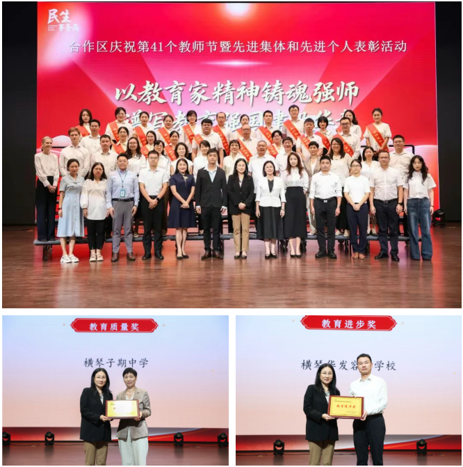 合作区举办庆祝第41个教师节暨先进集体和先进个人表彰活动,共表彰“先进集体”2个、优秀教师13名、优秀教育管理工作者8名。此外,横琴子期中学获“教育质量奖”,横琴华发容闳学校获“教育进步奖”。