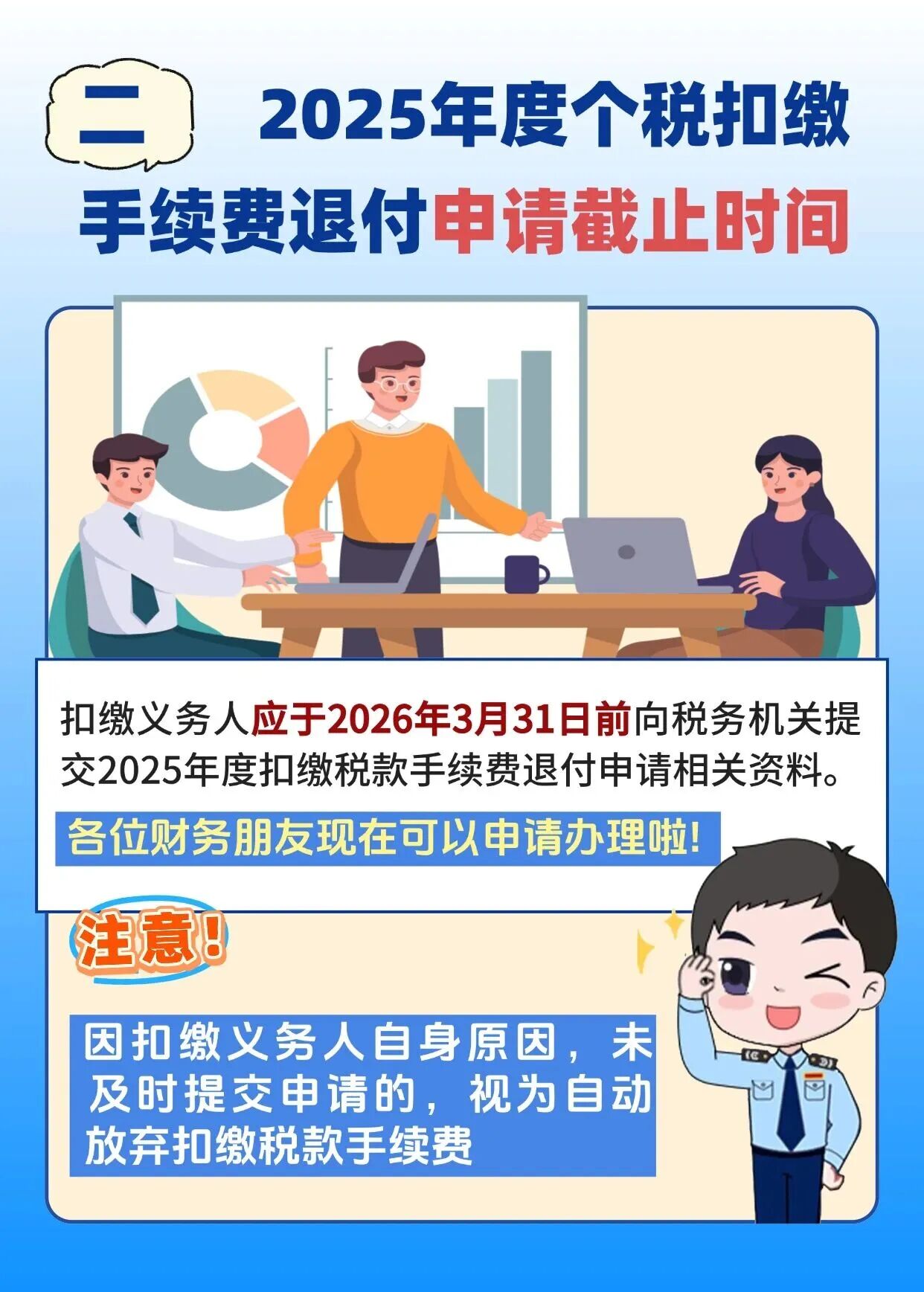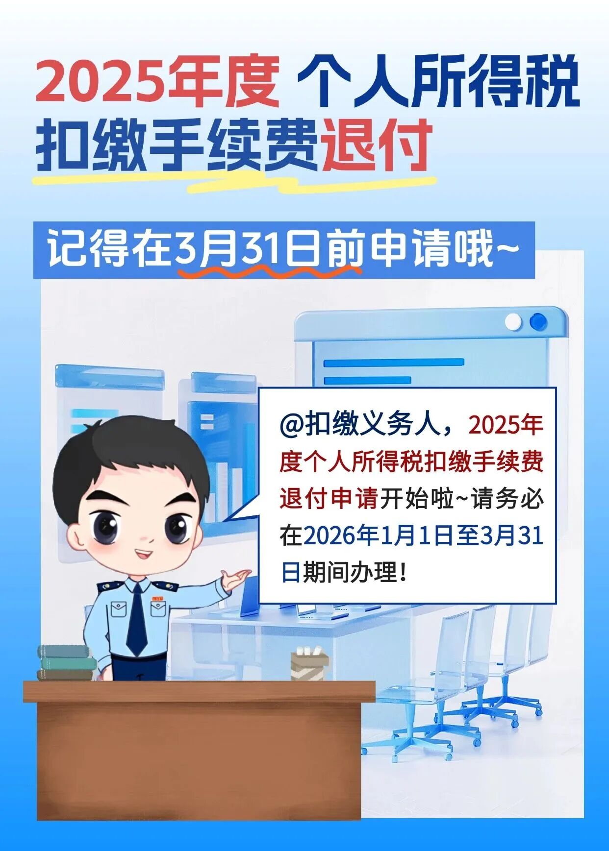 @扣缴义务人,2025年度个人所得税扣缴手续费退付申请开始啦,请在2026年3月31日前办理。怎么退付?一起来看看操作指引。