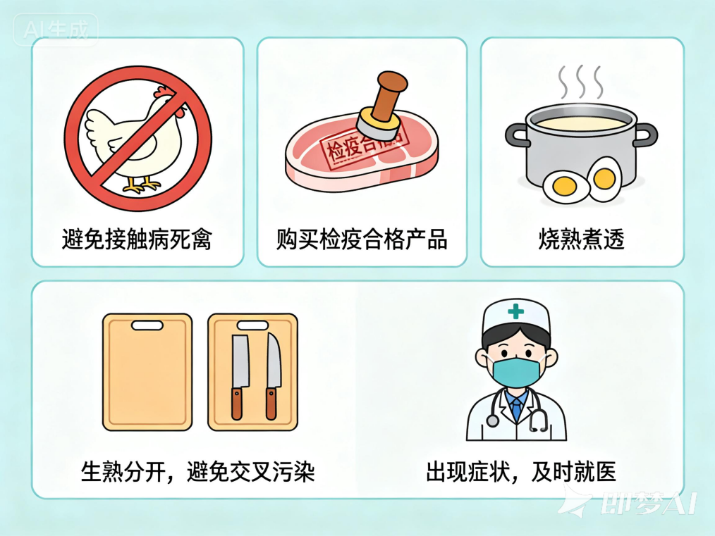 禽肉和蛋类要彻底煮熟,做到生熟分开,处理生禽的用具不能用于处理熟食。若接触禽类后出现不适症状,应及时就医。