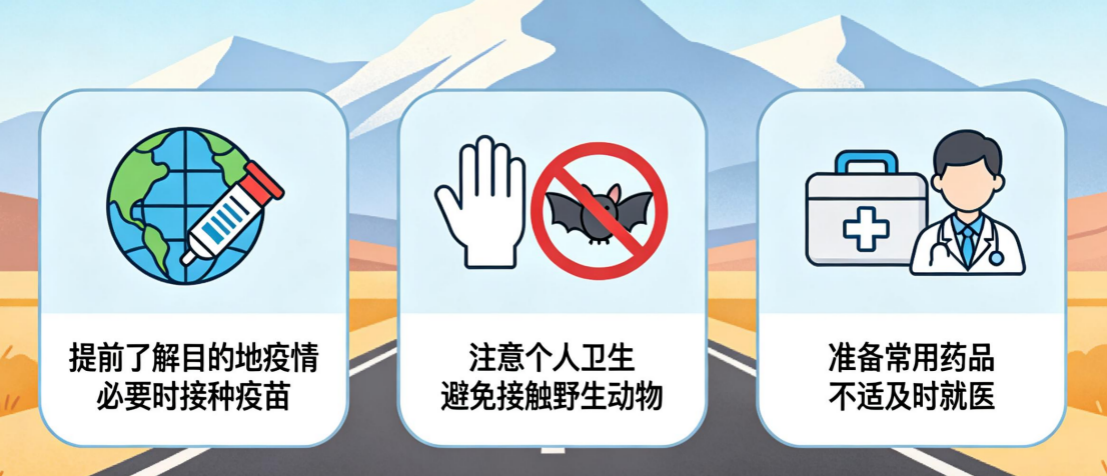 在旅行过程中,要注意个人卫生,避免接触野生动物。同时,需准备好常用药品,若身体出现不适症状,应及时就医。