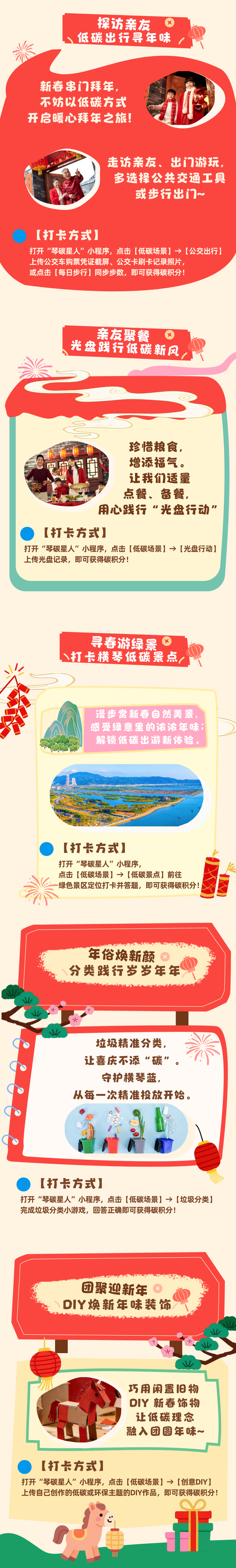 3.新春假期里,打开“琴碳星人”小程序,坚持每天解锁低碳场景打卡(共14个低碳场景、16种积分方式),累积积分,为团圆战队争取满碳积分。