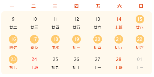 2月24日(周二)开始上班至2月28日(周六)!平时设置工作日闹钟的朋友,别忘了定闹钟,避免迟到。
