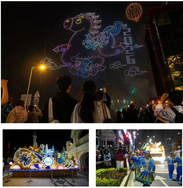 春节期间,由澳门特区政府旅游局呈献的新春贺岁活动——“金骏云翔 欢乐春节”无人机烟花汇演映照琴澳夜空,横琴主题花车也闪耀亮相澳门新年花车汇演,两地精彩活动联动,吸引大批游客深度体验“澳琴联游”“一程多站”的魅力。