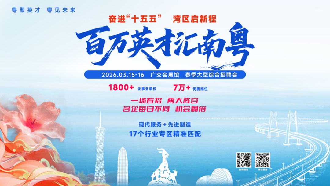 “百万英才汇南粤”春季大型综合招聘会将于3月15日-16日在广交会展馆-D区启幕,汇聚1800+企事业单位,释放7万+优质岗位,向各路英才发出诚挚邀约。