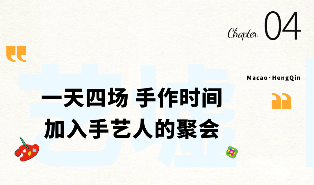 今年的“澳门·横琴艺墟”诚意满满,安排1天4场手工体验活动,果壳铃DIY、葡式瓷砖手绘、植物拓染、拼豆、咖啡香牌、草本香囊、树脂黏土、手工钩织……