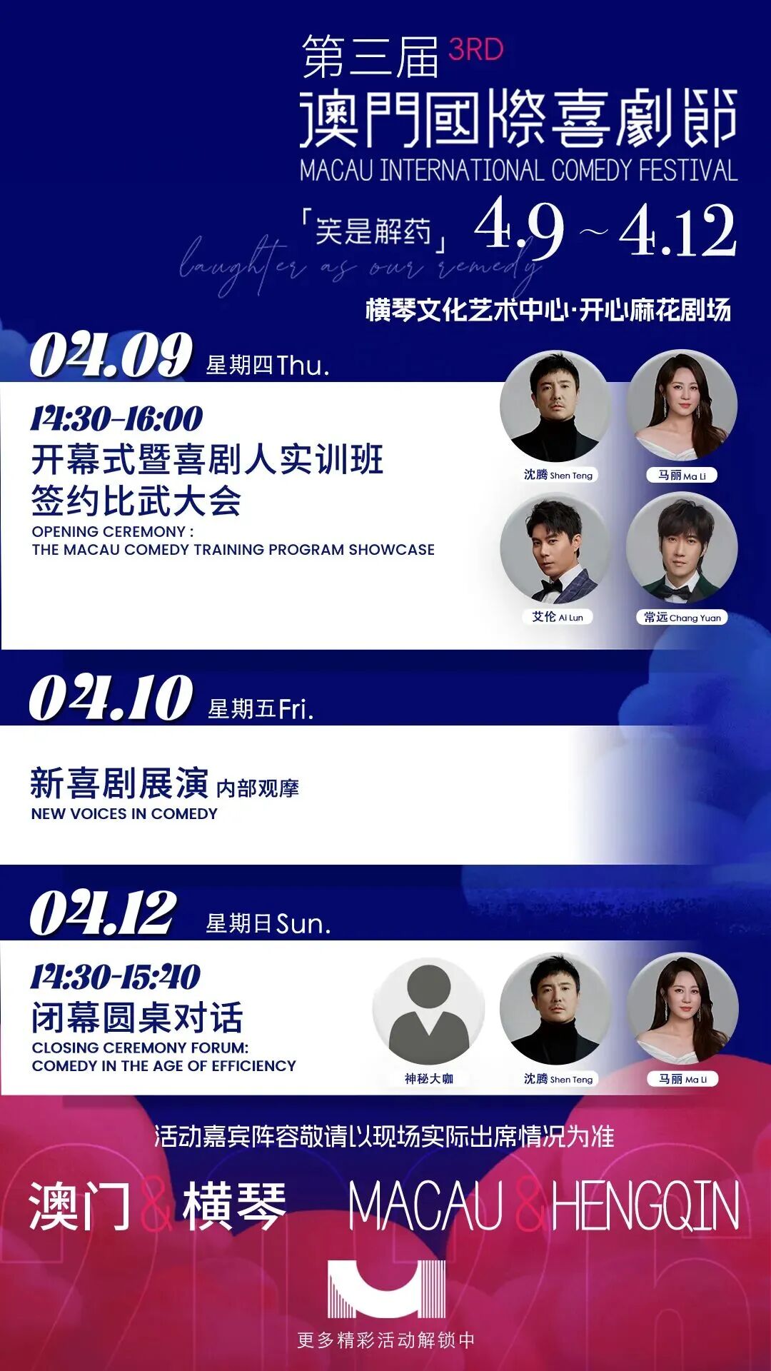 与此同时,第三届澳门国际喜剧节同期盛大启幕,4月9日至4月12日于澳门、横琴两地开启四天欢乐旅程。