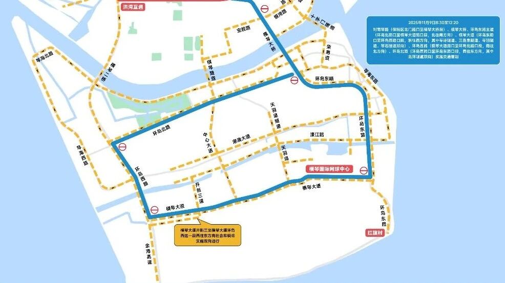 2. 11月9日8:30至12:20,对南琴路(保税区北门路口至横琴大桥段)、横琴大桥、环岛东路主道(环岛北路口至横琴大道路口段,北往南方向)、横琴大道(环岛东路口至环岛西路口段,东往西方向,其中琴诗隧道、三叠泉隧道、琴羽隧道、琴石隧道双向)、环岛西路(横琴大道路口至环岛北路口段,南往北方向)、环岛北路(环岛西路口至环岛东路口段,西往东方向,其中北环隧道双向)实施交通管制。