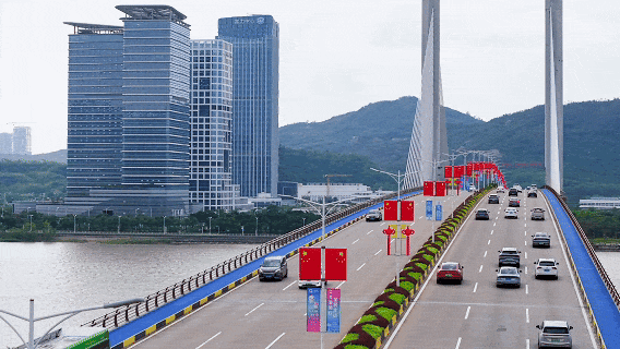 横琴大桥、环岛北路、港澳大道、濠江路等多条道路上,“全民全运 琴澳同行”、“激情全运会 活力大湾区” 、自行车项目介绍三款主题道旗整齐排列,浓厚的赛事氛围扑面而来。