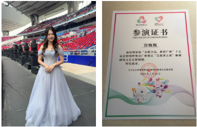 不久前,容甄甄作为十五运会的文艺志愿者,在十五运会开幕式“序曲”暖场表演中,与其他歌手共同演唱了《紫荆花盛开》歌曲。此外,她和朋友们为十五运会共同创作的两首原创歌曲,也均由官方“收编”,作为澳门赛区主题宣传歌曲正式发布。