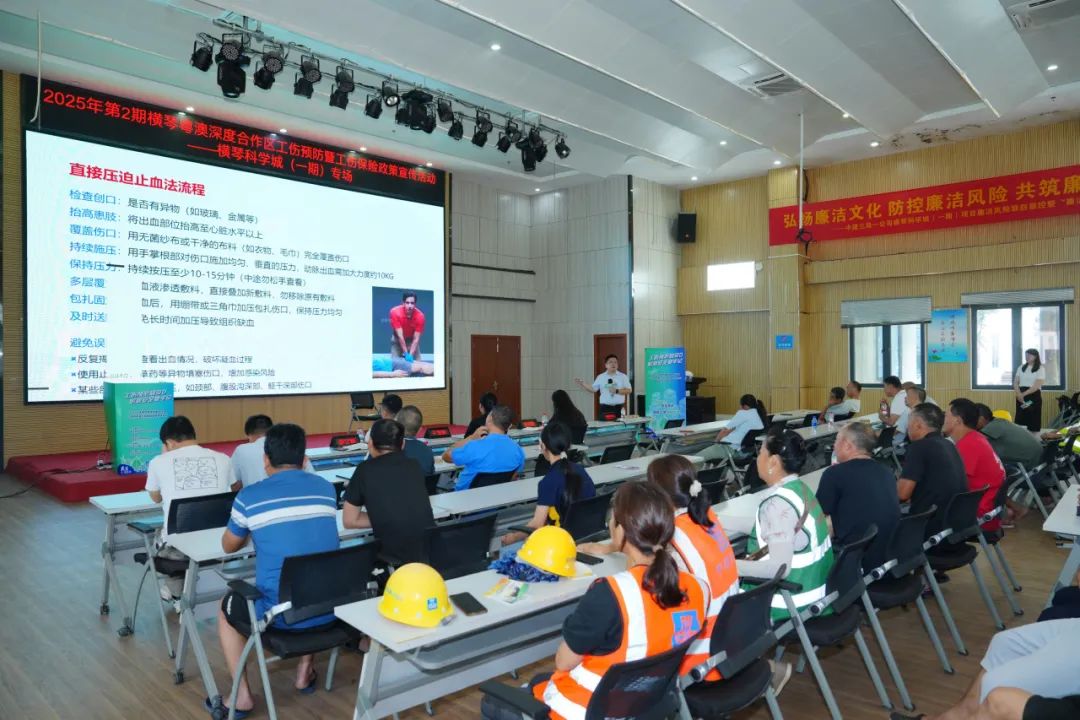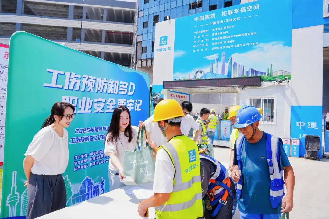 为深入落实《广东省工伤预防五年行动计划实施方案》,2025年上半年,横琴粤澳深度合作区民生事务局以“工伤预防知多D,职业安全要牢记”为主题,联动企业、协会及专业机构走进重点工地,共同开展了四期系列工伤预防宣传活动,累计培训建筑工人279人次,派发政策手册、清凉礼包等物资381份,推动工伤预防知识从“入耳”到“入心”,为合作区劳动者权益保障注入新动能。