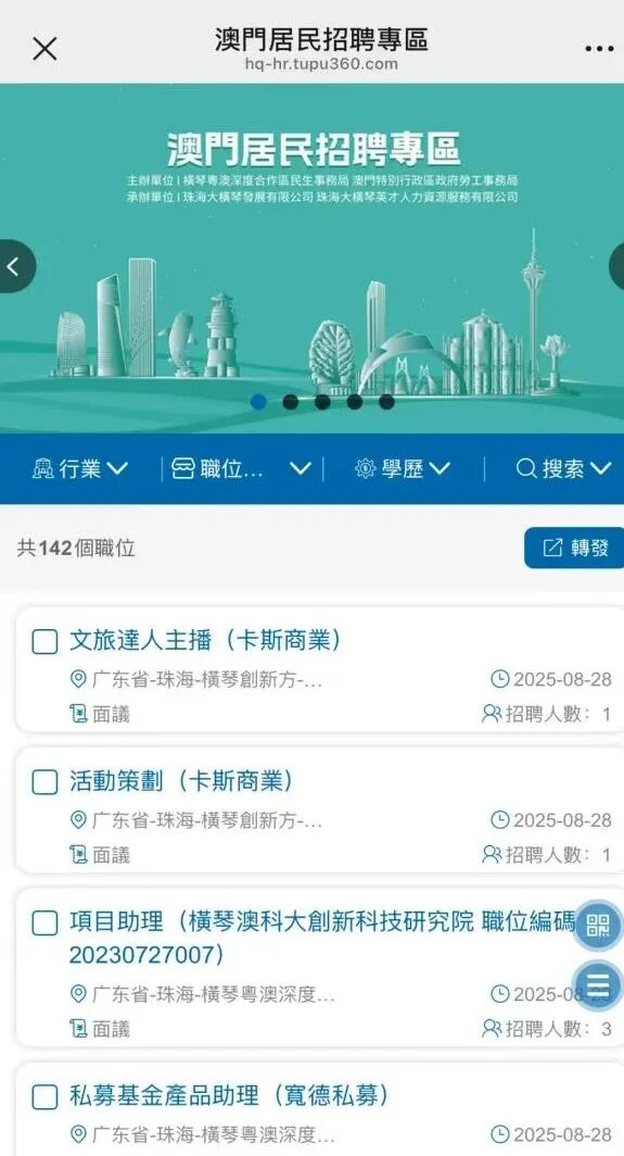 “澳门居民招聘专区”汇聚了合作区企业专门面向澳门居民开放的职位!