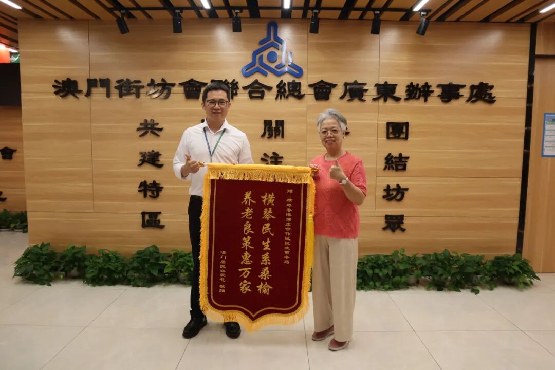 9月5日下午,居住在横琴粤澳深度合作区小横琴社区的澳门长者梁爱花,将印有“横琴民生系桑榆,养老良策惠万家”的锦旗亲手送到合作区民生事务局社会保障处相关负责人手中。