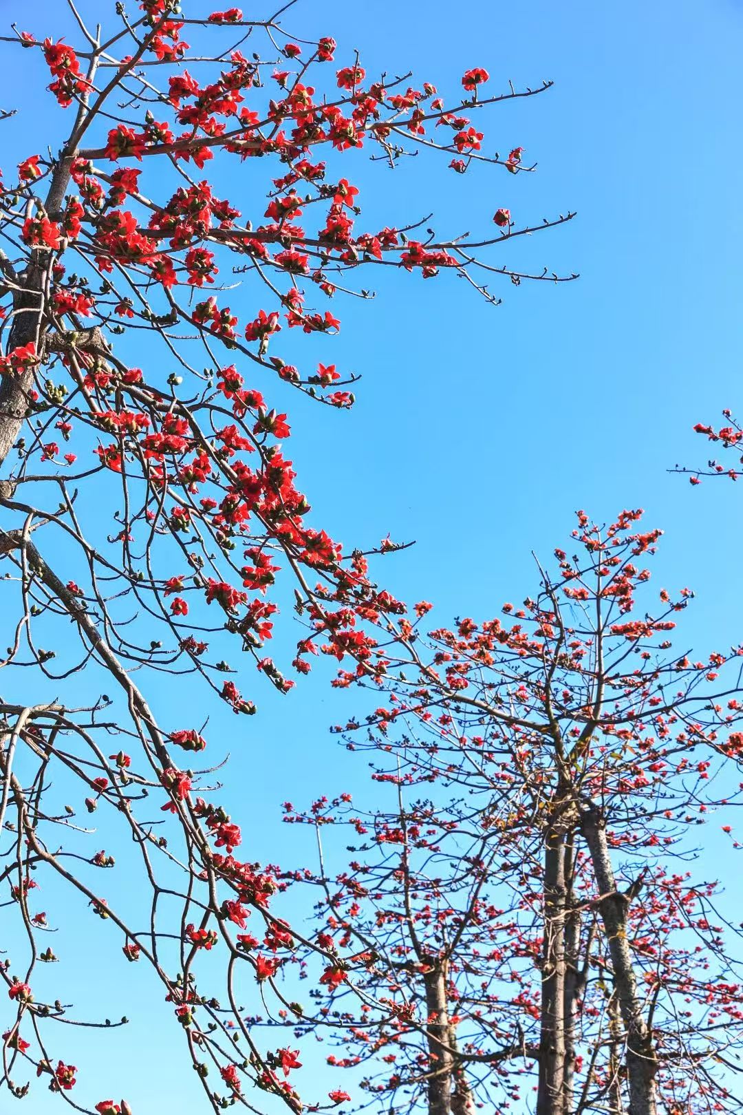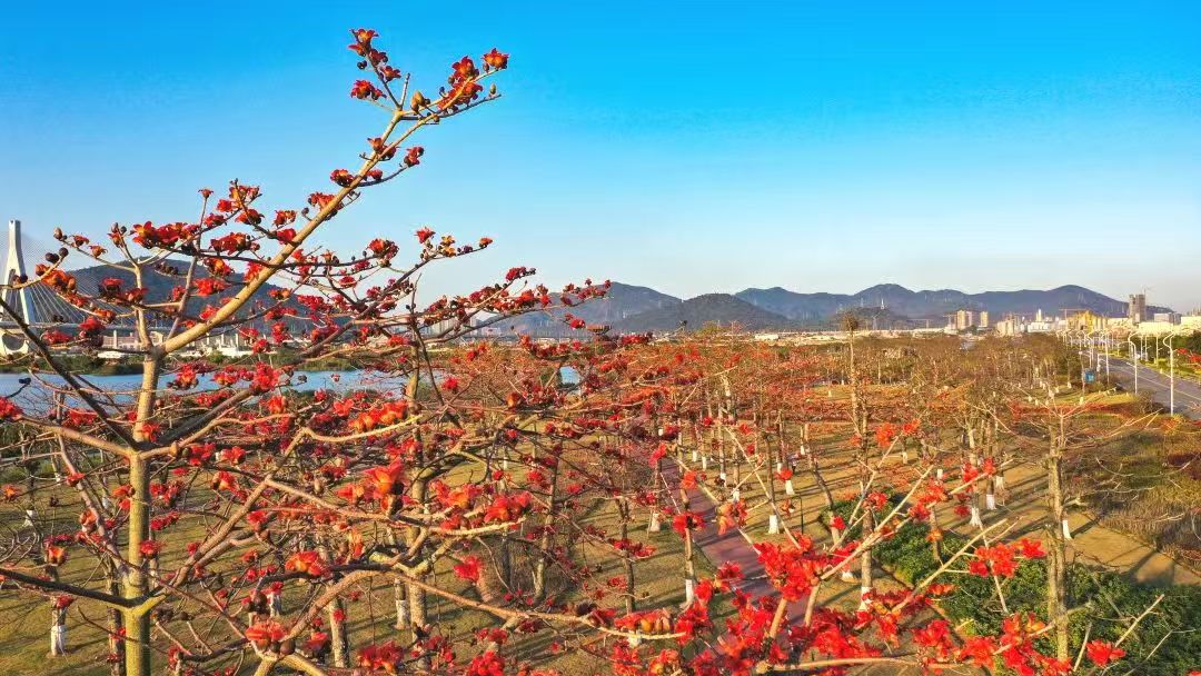 约2000株本地木棉在春天盛开,鲜红的木棉花与蓝天向伴仿佛是 大自然的油画,构成一幅城市与自然和谐发展的花海生态画卷。