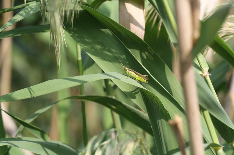 雄虫较小,体背灰褐色或红褐色,头部下方绿色,复眼淡褐色,复眼后方有一条宽型的黑褐色纵带延伸到翅膀末端,前胸背板坚硬像马鞍达侧缘,中、后胸愈合不能活动,体侧和各脚绿色,翅膀长过腹端。雌虫产卵管无明显突出,交尾时腹端侧向相接,雌虫产卵于地下约10公分深,卵约50粒,通常在夜间进行。