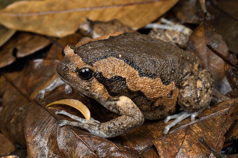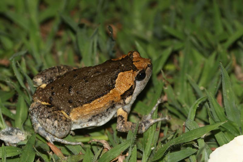 全身浅棕色,中央位置有背心形深褐斑纹。背部皮肤散布疣粒。
