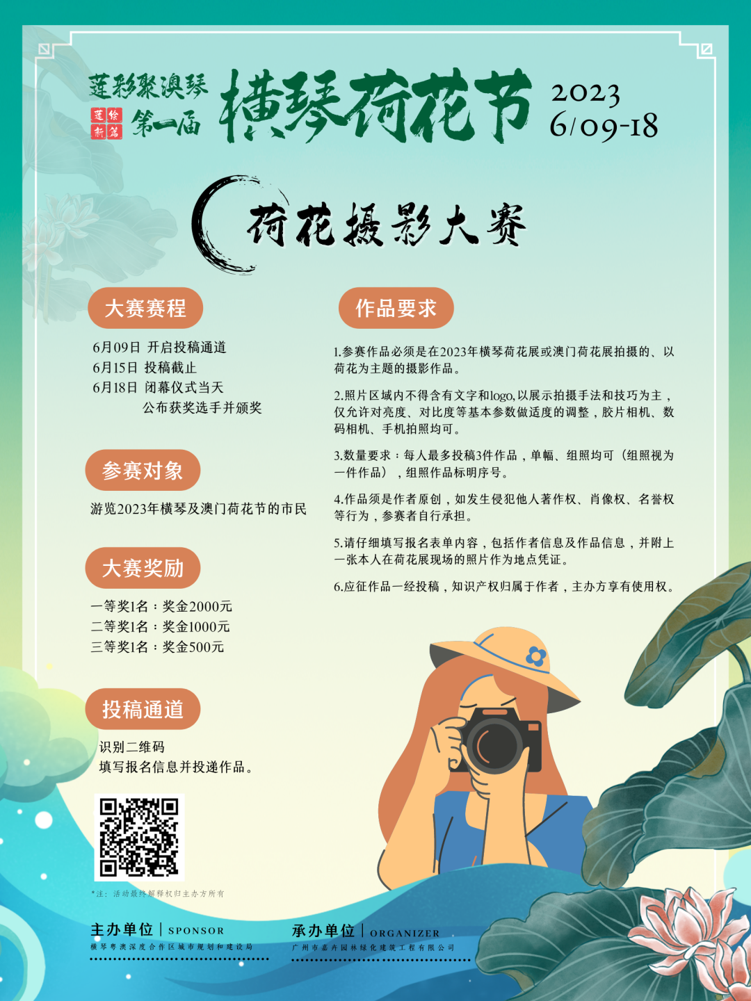 参赛作品必须是在2023年横琴荷花节或澳门荷花节拍摄的、以荷花为主题的摄影作品,以鼓励公众欣赏荷花节美景探索荷花科学与文化,拍摄精美作品。