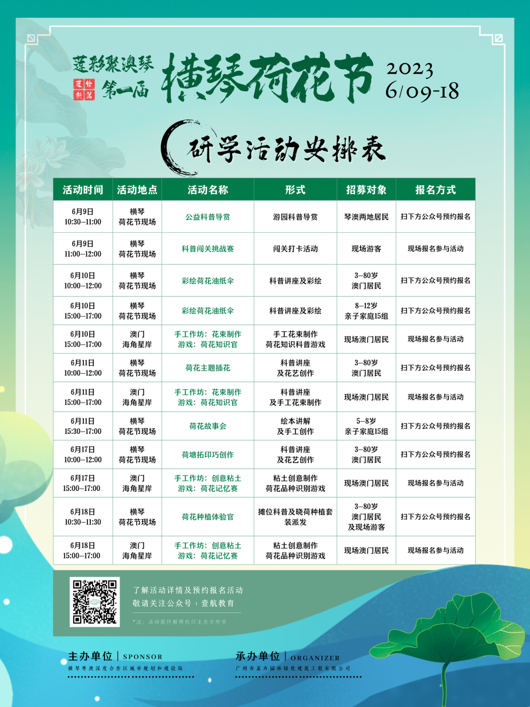 荷花节期间将围绕荷花开展主题研学等活动,带领参与者感受荷文化魅力,增长科学知识,提升审美品位,增强琴澳两地居民的文化认同和文化自信。有兴趣参与研学活动的市民,可关注横琴城规建局官方微信公众号或扫描下方海报内二维码了解活动详情及报名方式。