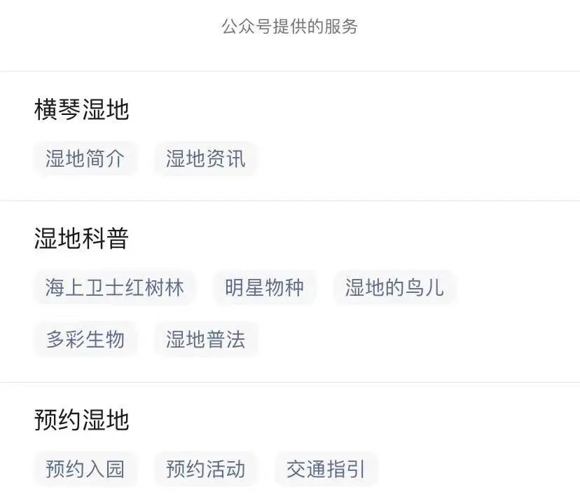 “横琴湿地”微信公众号将在底栏设置三大板块:“横琴湿地”展示“湿地介绍”、“湿地资讯”,以提供横琴湿地基础信息;“湿地科普”设置“海上卫士红树林”“明星物种”“湿地的鸟儿”“多彩生物”等栏目,以生动有趣的短文与生态美景图频介绍横琴丰富多彩的生物多样性;“预约湿地”版块,则是为湿地科普研学活动而设,横琴湿地将结合每年自然相关节日,常态化举办科普研学、观鸟导赏等线下活动,公众号将发布活动最新消息,喜爱横琴湿地的自然爱好者们再也不会错过任何一次拥抱自然、感受自然的机会。