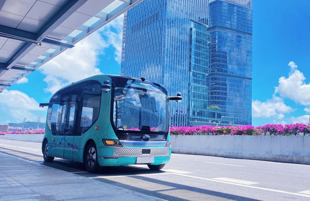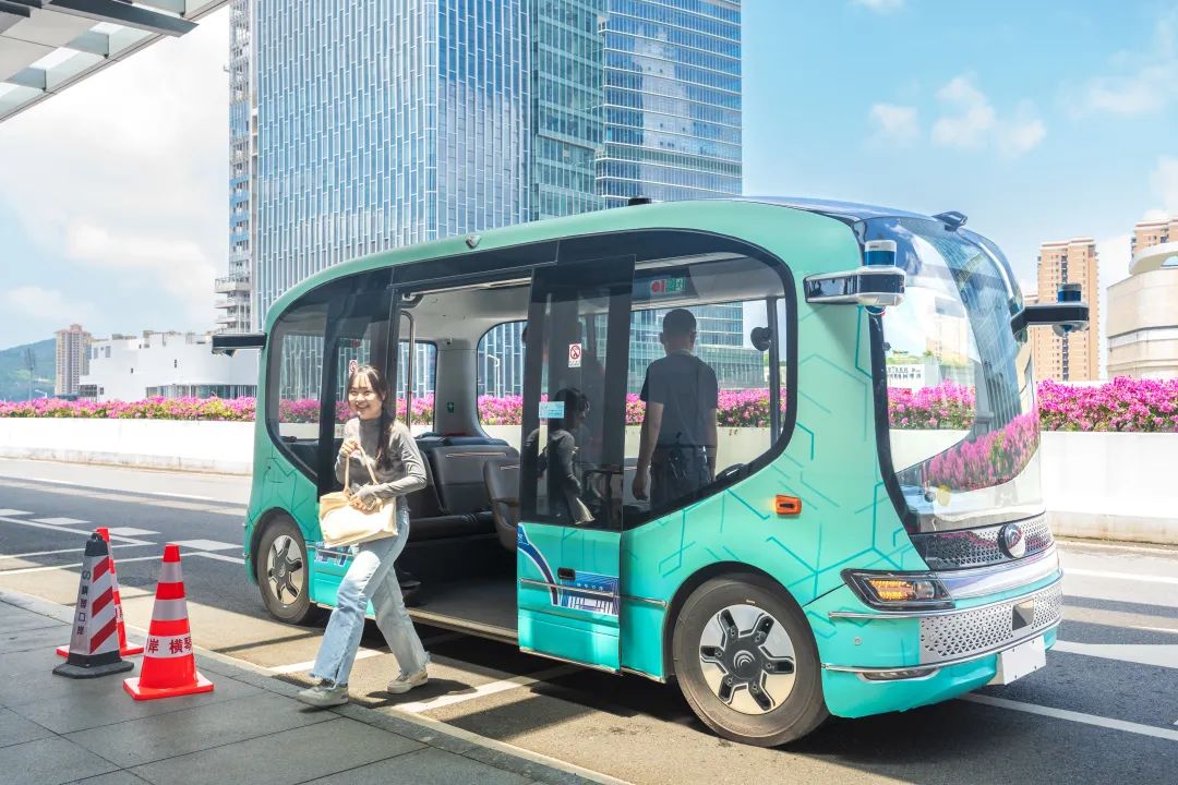 印有“网联汽车 智行横琴”车身标识、拥有高饱和度“多巴胺”外观的无人驾驶小巴,载着试乘人员从横琴口岸准时出发。