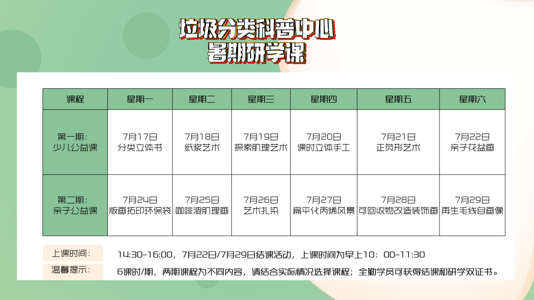2022年,联合专业艺术机构首创垃圾分类原创系列科普课程,将垃圾分类知识巧妙穿插在科普课程中,涵盖立体书制作、纸浆艺术、艺术扎染、肌理绘画等多种形式。