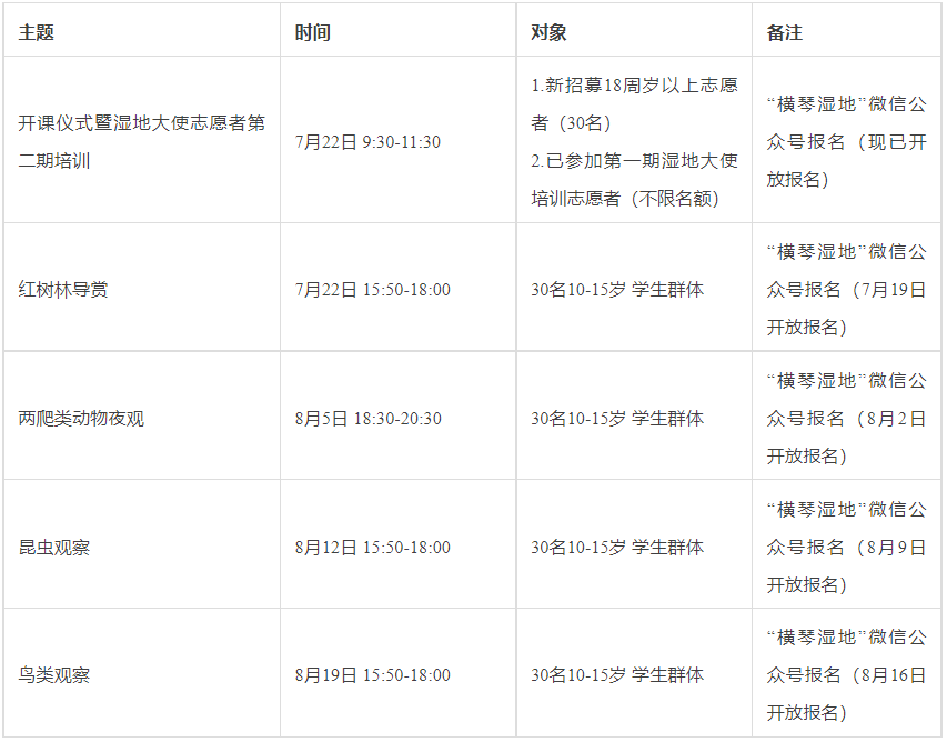 暑期研学课堂活动在“横琴湿地”微信公众号发布报名信息(详情可关注公众号查看具体内容)