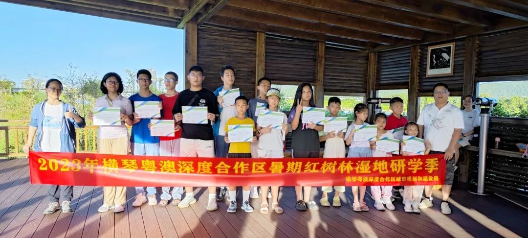 课堂最后,同学们在自然教育径尾部的观鸟屋积极参与互动问答,圆满完成了本次红树林研学课程,横琴城规建局也为参与培训的学员们颁发了研学证书,同时也希望同学们在未来的红树林保护和生态保育学习中有更多的收获。