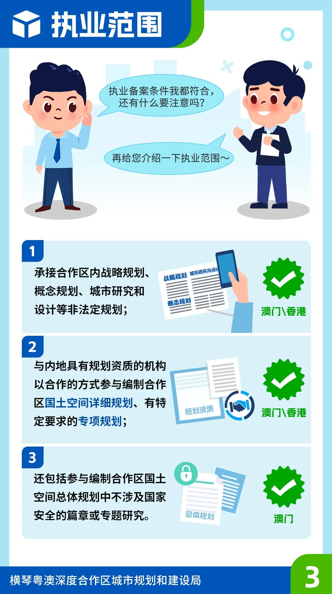 ● 关于执业范围。《办法》明确,具体为承接合作区内战略规划、概念规划、城市研究和设计等非法定规划;与内地具有规划资质的机构以合作的方式参与编制合作区国土空间详细规划、有特定要求的专项规划。此外,经备案的澳门规划专业机构及专业人士的执业范围除上述内容外,还包括参与编制合作区国土空间总体规划中不涉及国家安全的篇章或专题研究。