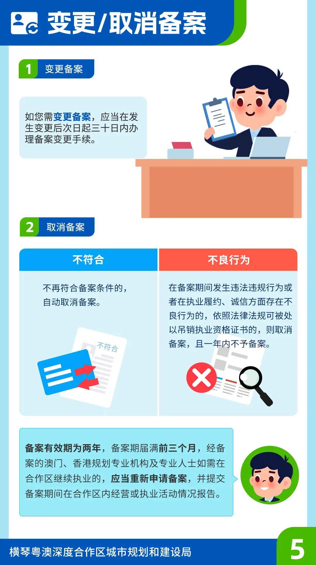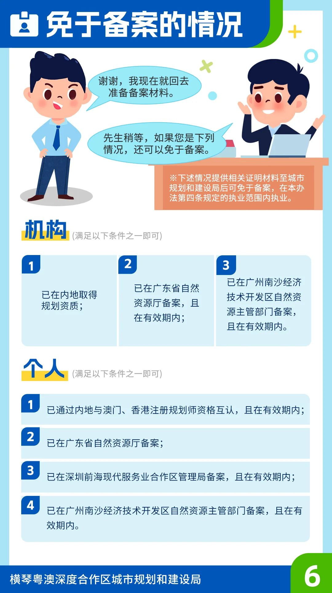 ● 关于备案相关手续。《办法》明确了变更备案、取消备案、备案有效期及备案期届满的说明和规定,并对提供相关证明材料后无需备案即可在合作区进行规划服务的专业机构、人士进行明确。
