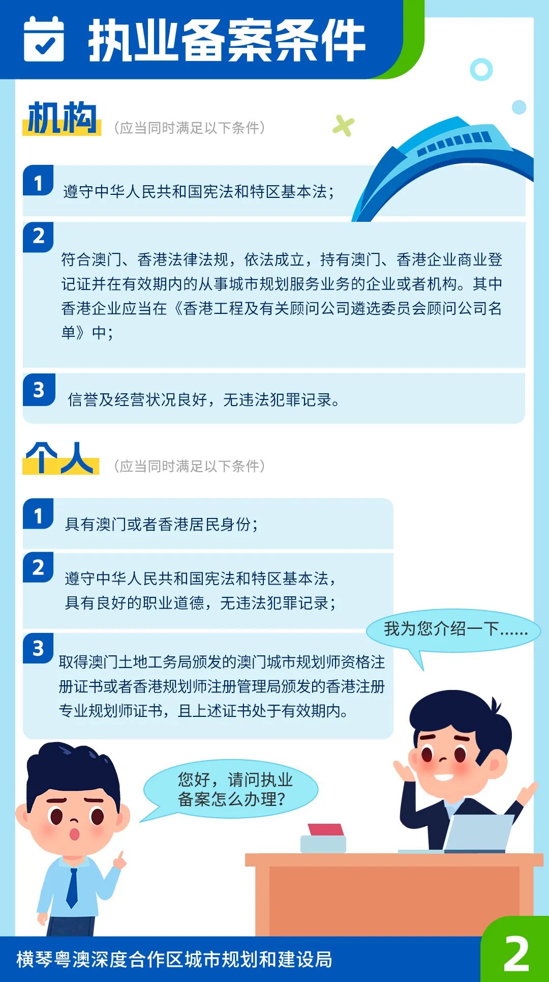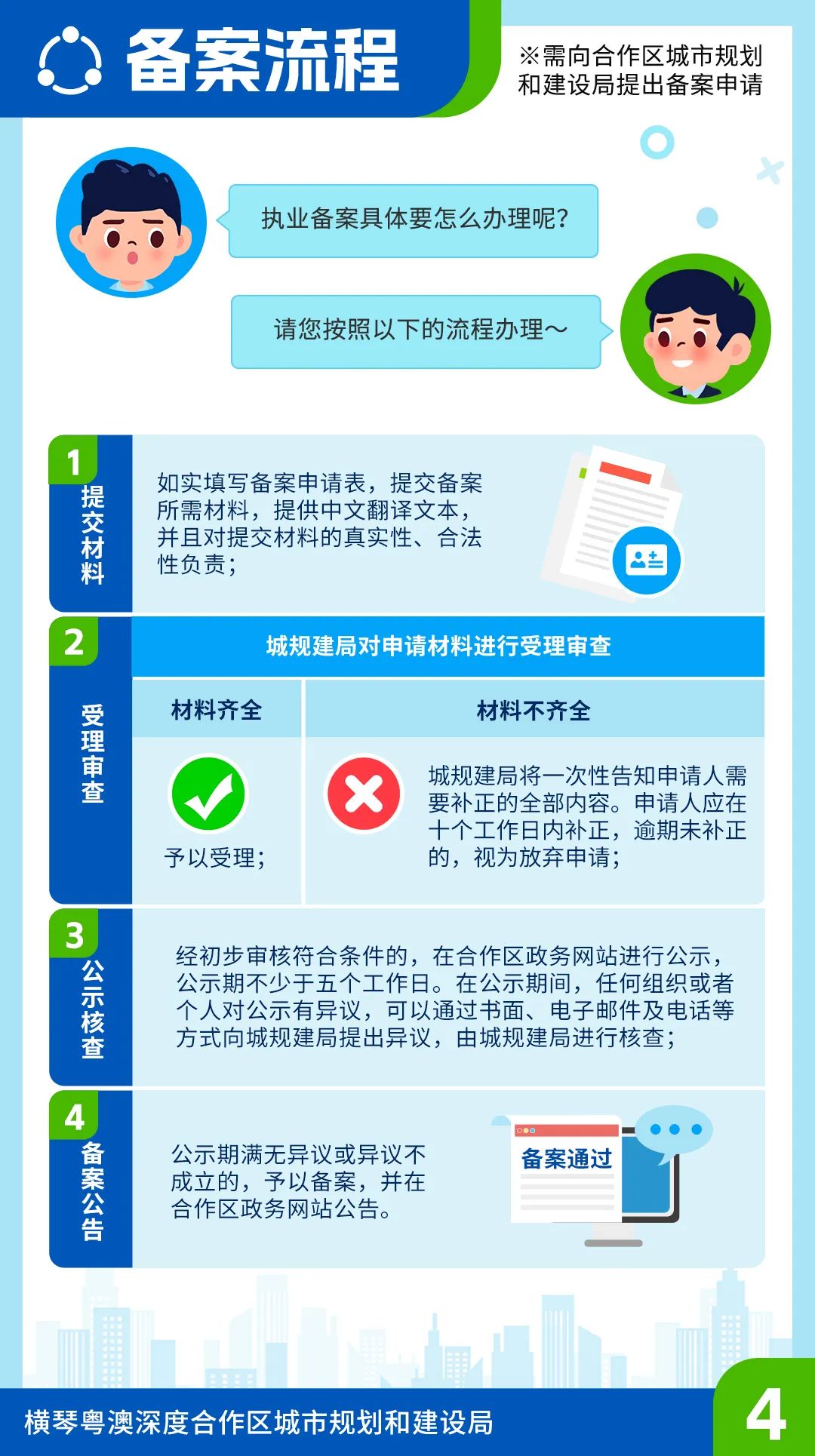 ● 关于执业备案流程。《办法》明确了澳门、香港地区城市规划专业机构、人士在合作区备案的政府受理部门、所需材料及备案流程、公示公告流程。