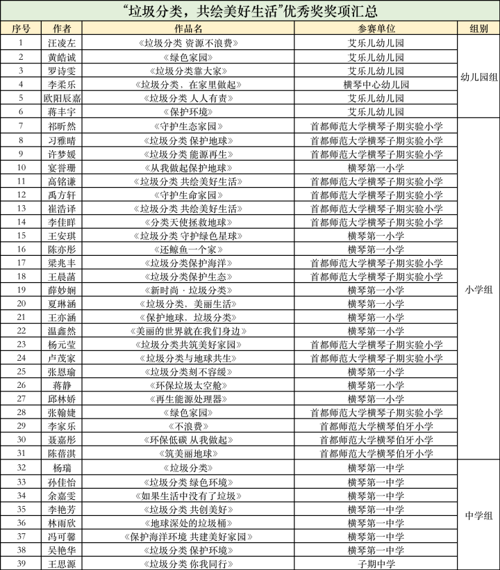 恭喜以上获奖同学、老师及学校!评委表示“在这次评选中,我们要向所有参与的小朋友表示赞赏和鼓励,同时也要感谢所有家长和老师们的支持和教育,让我们看到了垃圾分类对于建设美丽横琴的重要意义。”