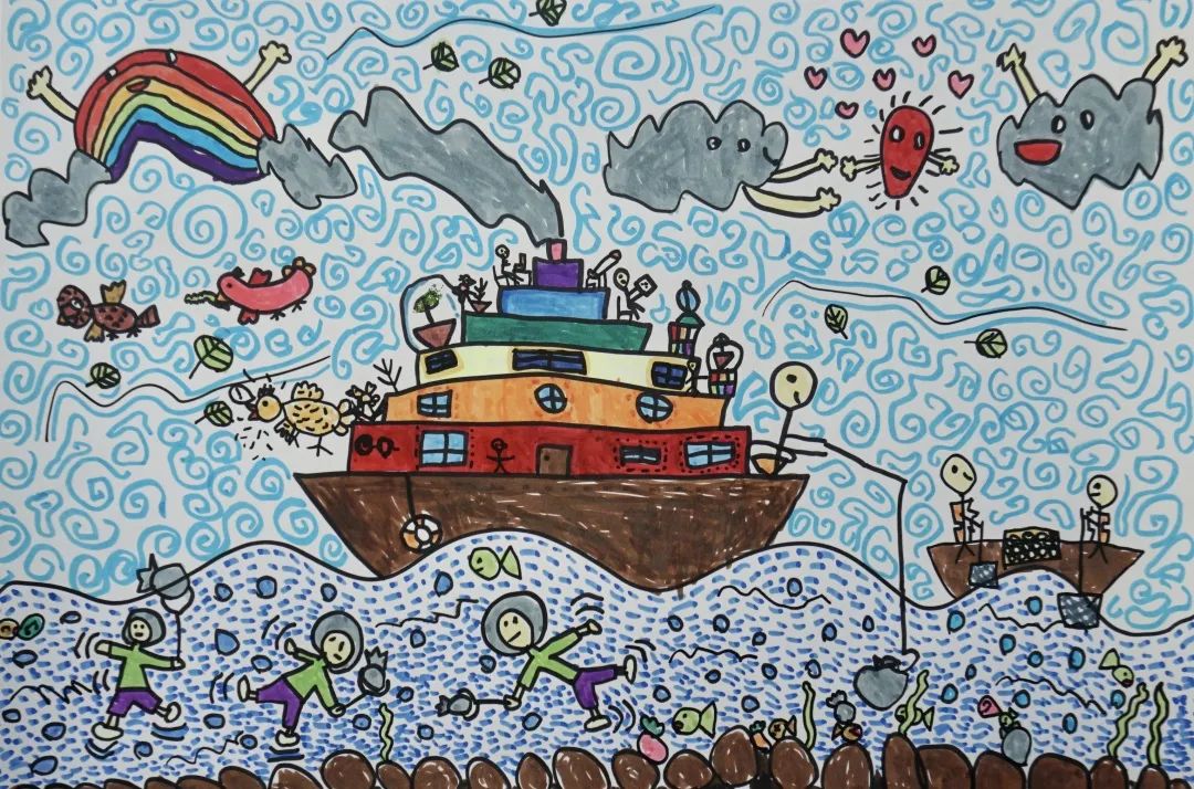 评委小组点评:天空、大海、水下生物与人,形式感独特,想象力非常丰富。画面以船为中心,内容向周围展开,蓝色的海浪单线满底纹表达,使画面产生动感,空中的彩虹、太阳、云朵与小鸟相互交流和谐生动。强调要爱护海洋,不乱扔垃圾,描绘了心中分类下美好生活的景象,完全是幅幼儿绘画佳作。