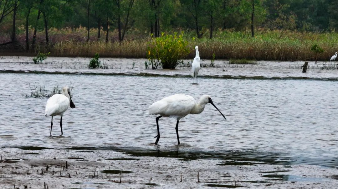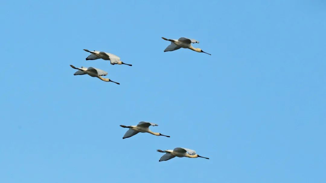黑脸琵鹭是国家一级保护动物,是鹈形目鹮科的鸟类,全身羽毛大体为白色,有黑嘴和黑色腿、脚,前额、眼先、眼周至嘴基的裸皮黑色,形成鲜明的“黑脸”。因扁平如汤匙状的长嘴与中国乐器琵琶极为相似而得名,亦因其姿态优雅被称为“黑面天使”或“黑面舞者”。黑脸琵鹭的捕食动作非常有趣,一边在水中缓慢行走,一边将嘴插入泥水中左右摆动搜索,通过触觉捕捉到水底层的鱼、虾、蟹等,捕到后就把长喙提出水面将食物吞吃。