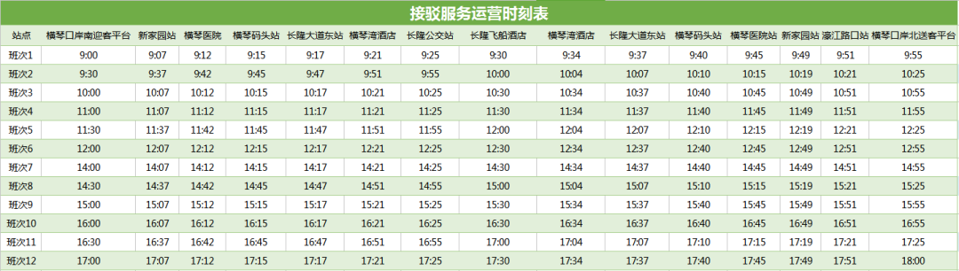 长隆飞船酒店、横琴湾酒店、长隆大道东站、横琴码头站、横琴医院站、新家园站、濠江路口站、横琴口岸北送客平台。