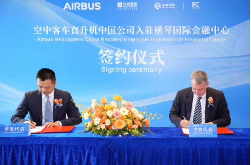 7 月 24 日,世界500强公司空客直升机中国总部入驻横琴国际金融中心(IFC)签约仪式圆满举办。横琴粤澳深度合作区(简称:合作区)执委会副主任符永革、空中客车直升机中国公司董事总经理柯霖 (Colin James)、华发股份珠海大区联席总经理胡雨波、合作区经济发展局投资促进处副处长张升等出席活动。