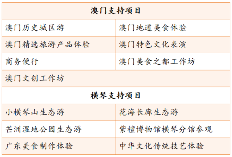报名企业可根据自身活动需要,选择不同的支持项目进行申报。合作区经济发展局、澳门旅游局审核评估通过后,旅客团可根据相关要求游玩所申报项目。