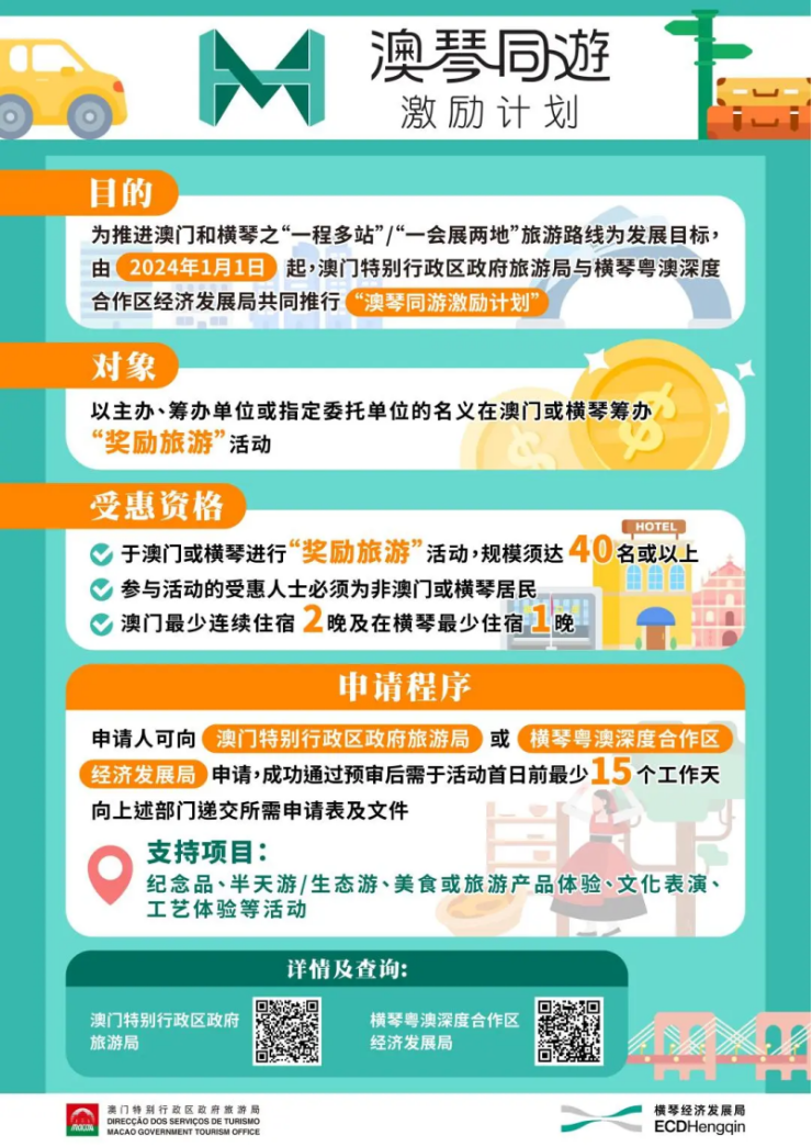 今年1月,合作区经济发展局联合澳门旅游局全新推出“澳琴同游激励计划”,首阶段针对来澳门及横琴筹办“奖励旅游”的商务旅客团给予多项支持。