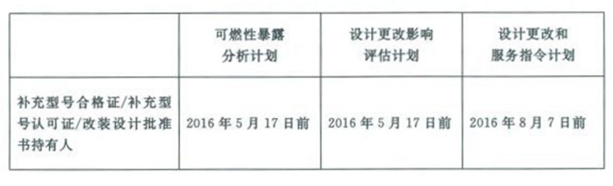 (4)补充型号合格证/补充型号认可证/改装设计批准书(包括对现有补充型号合格证/补充型号认可证/改装设计批准书的修改)的申请人,若在2011年12月7日前提出申请且在2011年12月7日后取得补充型号合格证/补充型号认可证/改装设计批准书:2016年5月17日或补充型号合格证/补充型号认可证/改装设计批准书批准日,以日期后者为准。