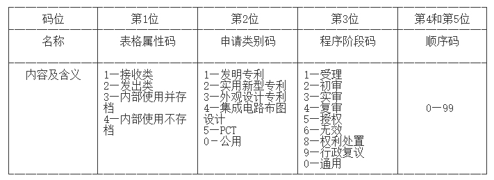 第1位是“表格属性码”,第2位是“申请类别码”,第3位是“程序阶段码”,第4、5位是“顺序码”。