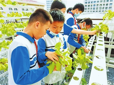 子期实验小学为了让学生体验农作物的种植过程,在教学楼楼顶开辟了种植园地。原本朴素的楼顶如今生机勃勃、绿意盎然。该校组织学生自己动手种蔬菜、水果,体验播种、施肥、浇水、除虫和收获一系列种植过程,并在此过程中详细记录自己负责的蔬果生长情况,与科学课程相结合,了解更多的学科知识。同时,该校聘请专业人士指导学生种植,让学生掌握更多的劳动知识与技能。在蔬果丰收时刻,开展教师评估、自我评诂和学生互评,对学生的动手能力、知识框架和设计水平进行多元评价,表彰评选出来的“劳动小达人”。