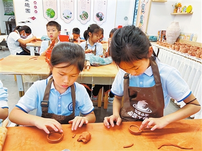 首都师范大学横琴伯牙小学注重中国传统文化的传承,按学段划分设计了陶艺、产业链、烘焙、劳动技术四大课程,教学内容层层递进。本学期,该校从季节的变化出发设计课程,比如一二年级主要以薄荷为原材料,制作相关的产品;三四年级主要以种植和学习运用劳动工具为主,每学期学习种植一种蔬果。