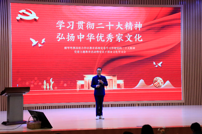 为进一步贯彻落实党的二十大关于“弘扬中华传统美德,加强家庭家教家风建设”以及“传承中华优秀传统文化”的要求,11月24日上午,横琴粤澳深度合作区教育系统党委开展“学习贯彻党的二十大精神,弘扬中华优秀家文化”党建主题教育活动暨横琴党员干部学习家文化学习会,来自合作区教育系统党委的党员干部及10所学校的40余名教师代表现场参加活动,60余名教师线上观看学习。