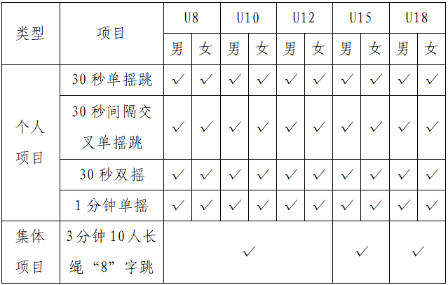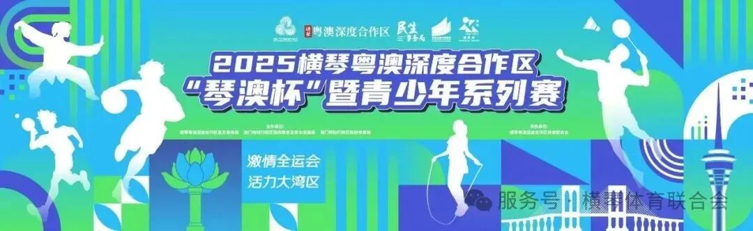 赛事介绍 01 竞赛规程 赛事名称: 2025年“琴澳杯”系列赛暨青少年跳绳赛 比赛时间: 2025年9月14日 比赛地点: 主办单位: 横琴粤澳深度合作区民生事务局 澳门特别行政区政府教育及青年发展局 澳门特别行政区政府体育局 承办单位: 横琴粤澳深度合作区体育联合会 竞赛分组及项目 参赛年龄组别(每个年龄段分男子组、女子组): ▶ U18(16-18岁):2007年1月1日—2009年12月31日出生; ▶ U15(13-15岁):2010年1月1日—2012年12月31日出生; ▶ U12(11-12岁):2013年1月1日—2014年12月31日出生; ▶ U10(9-10岁):2015年1月1日—2016年12月31日出生; ▶ U8(7-8岁):2017年1月1日— 2018年12月31日出生。 02 竞赛项目设置 个人项目: (1)30秒单摇跳(男子、女子); (2)30秒间隔交叉单摇跳(男子、女子); (3)30秒双摇跳(男子、女子); (4)1分钟单摇跳(男子、女子)。 集体项目(混合组,至少有1名异性): 混合3分钟10人长绳“8”字跳。 参赛要求 参赛资格: ▶ 在横琴粤澳深度合作区及澳门就读的7-18岁青少年,需提供身份证明、学生证等相关证明; ▶ 为确保青少年在参加赛事期间的安全与健康,根据赛事组织规定,需要青少年的监护人签署责任书,责任书涵盖对赛事风险认知、监护人对孩子参赛支持等重要内容。 健康要求: 参赛青少年须确保自身身体健康,无任何不适宜参加本次体育赛事的疾病或身体状况。在赛事筹备及进行期间,若出现身体不适,应及时向赛事工作人员报告。若因隐瞒健康问题而导致在比赛中出现意外,责任由参赛选手及其监护人自行承担。 02 竞赛办法 (1)采用国家体育总局最新审定的《2021-2024全国跳绳竞赛规则》。 (2)比赛只进行一轮比赛(决赛),各单项出场顺序赛前由竞委会统一随机抽签决定。 (3)30秒、1分钟单摇跳项目使用电子计数绳柄系统,请运动员自行准备绳体并在上场时安装,其余项目自带绳具。 (4)运动员不得无故弃权。凡无故弃权者,取消该项目成绩,不得参加后续的比赛。 (5)各队穿着统一的比赛服参赛。 03 关于弃权和申诉 弃权 运动员凡因伤病或其它原因不能继续比赛的,该场比赛按弃权论;运动员检录时迟到10分钟的,该场比赛按弃权论。 申述 各参赛队对运动员资格、年龄等提出异议,需遵循“谁举报、谁举证”的原则。申诉时须提交有本人签字的书面申请和支撑材料。比赛中运动员应服从裁判与赛场秩序,有异议时,应由领队凭比赛完整录像视频在公布成绩20分钟内向裁判长提出申诉。 04 奖励办法 各单项均录取前八名,不足8人(队)则按实际参赛人(队)数减一录取。 对获得个人项目各单项前八名的运动员颁发获奖证书,前三名分别颁发奖牌和奖品,如出现名次并列,该名次并列的下一个名次空出; 对获得集体项目前八名的运动员颁发获奖证书,前三名颁发奖品,第一名颁发奖牌,如出现名次并列,该名次并列的下一个名次空出。 05 报名方式 各代表队必须在2025年8月20日18点前,扫描下方二维码进入赛事报名系统。 自行注册后进行在线报名。一经报名,不得更改,逾期报名,视为弃权,不得参赛。 联系人:曾老师 联系电话:13719649803 以速度为弦 以节奏为律 在琴澳双城的活力脉搏中 见证少年跃动的风采! 期待与你在赛场上相见 共创精彩瞬间!