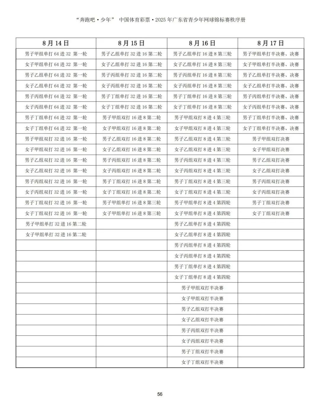 赛事共设甲、乙、丙、丁四个年龄组别,涵盖单打、双打、团体赛,共25个比赛项目。来自广州、深圳、珠海、东莞、江门、清远等省内19个地市的23支代表队,584名青少年网球运动员将齐聚横琴,在各项目中展开激烈角逐。