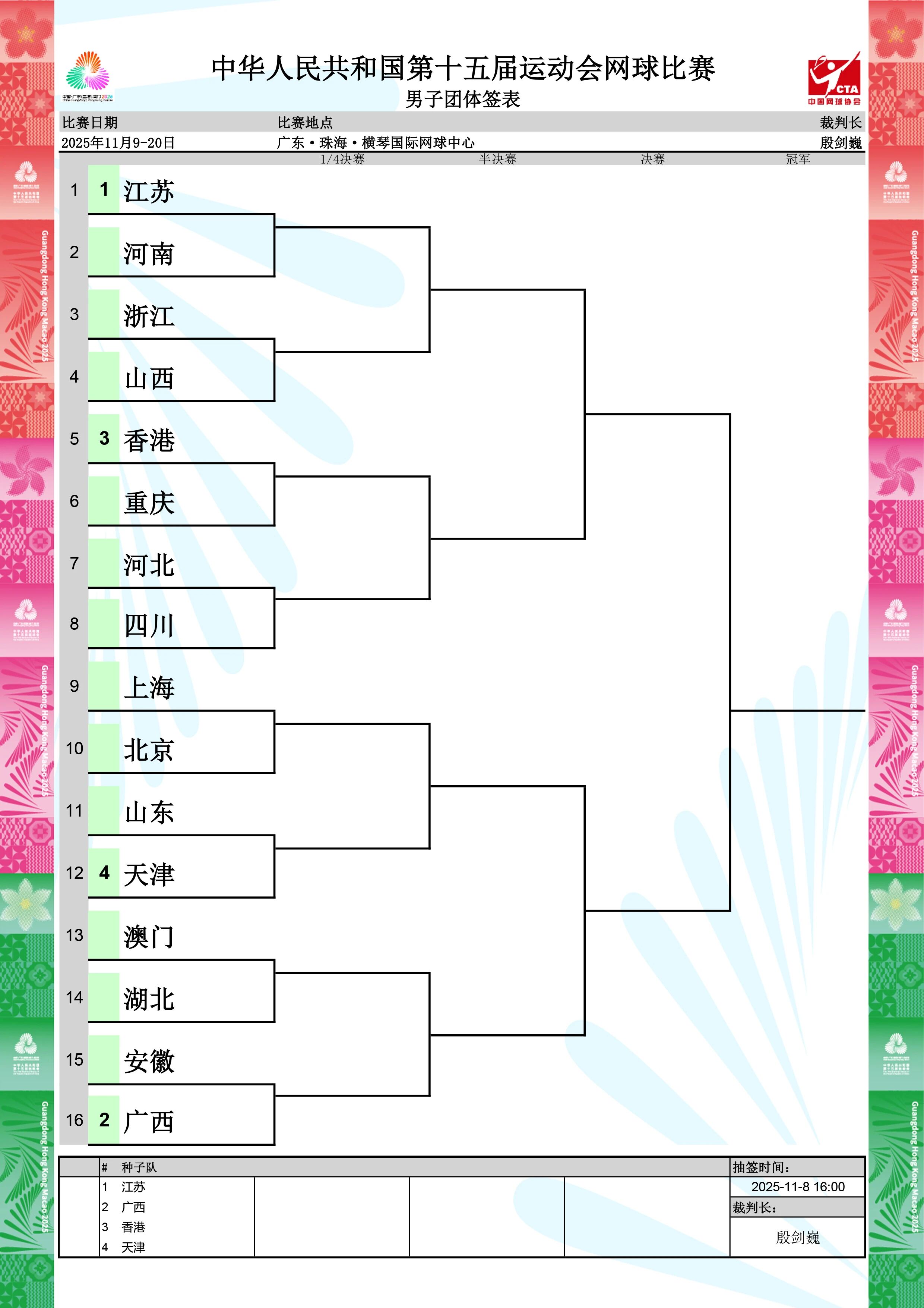 随着团体比赛签表出炉,十五运会网球比赛也将于明日正式拉开帷幕。11月9日至12日期间,各地代表队将按照赛程展开捉对厮杀,最终经过四轮赛事于12日决出团体赛两枚金牌