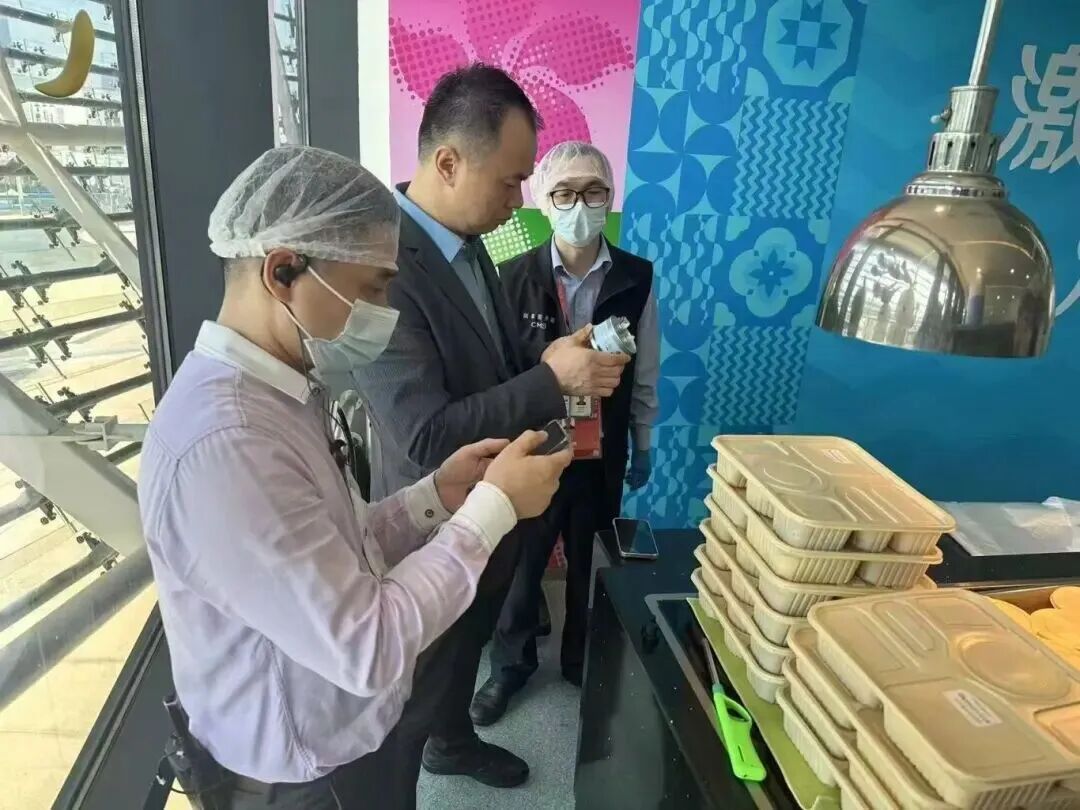 为确保赛事食品安全,综合保障处以“驻点监管+检验检测+智慧监控”联动模式构筑食品安全防线。对运动员酒店(马戏酒店)、技术官员酒店(横琴湾酒店)等实施驻点监管,严格把控从业人员健康、食材溯源、加工规范及配送流程,共派出监管人员200人次,完成39487人次用餐保障,实现核心场所、重点人群全覆盖。同步加强检验检测,共出动检验人员56人次,完成531批次样品检测,还依靠“互联网+明厨亮灶”平台持续开展线上巡查,在源头上消除食品安全隐患。